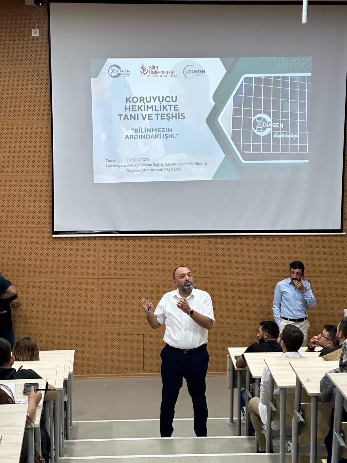 23/09/2025 tarihinde "DİAGEN KARİYER GÜNLERİ " kapsamında "Diagen Hayvan Sağlığı firmasının Satış ve Pazarlama Müdürü Veteriner Hekim Abdurrezzak Taşatan" ın katılımıyla "Koruyucu Hekimlikte Tanı ve Teşhis" konusu "BİLİNMEZLİĞİN ARDINDAKİ IŞIK..." başlığı altında hastanemizde seminer düzenlenmiştir.